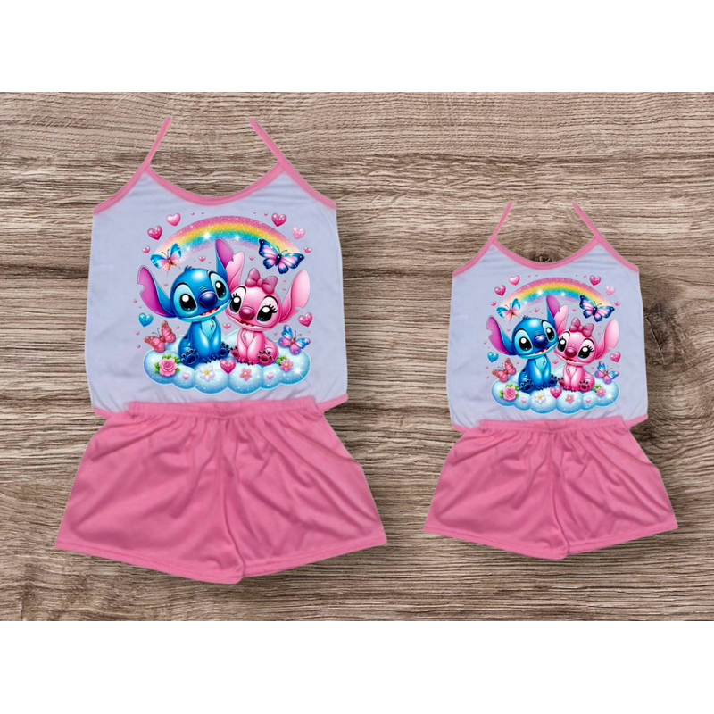 Kit Pijama mãe e filha short doll stitch pijama baby doll alça malha pp verão personagens