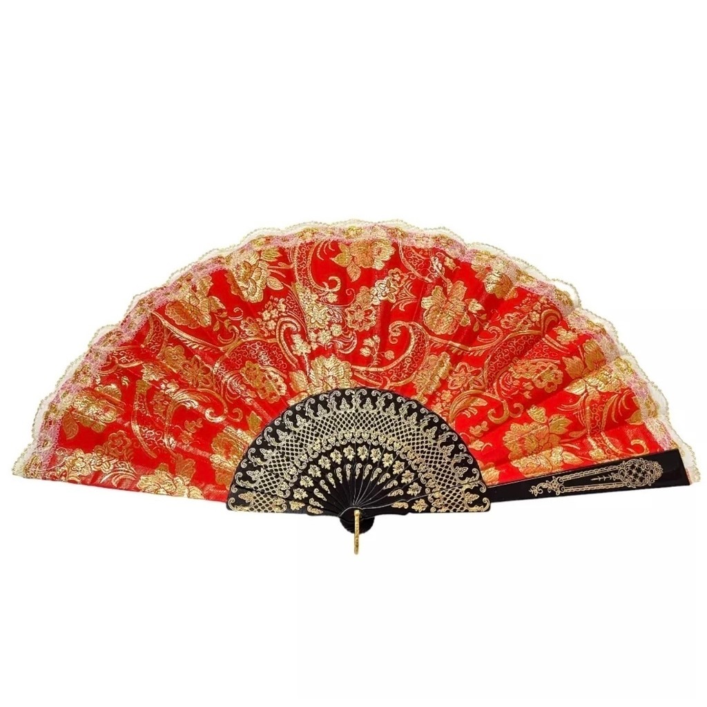 Leque Grande Tecido Cetim Brocado Brilho Luxo Cigano Dança - Vermelho | ShopRank