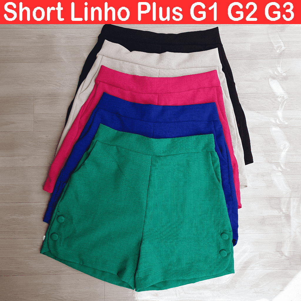 Short Feminino Plus Size Linho Social com bolso Botões forrados e Elástico na Cintura | ShopRank